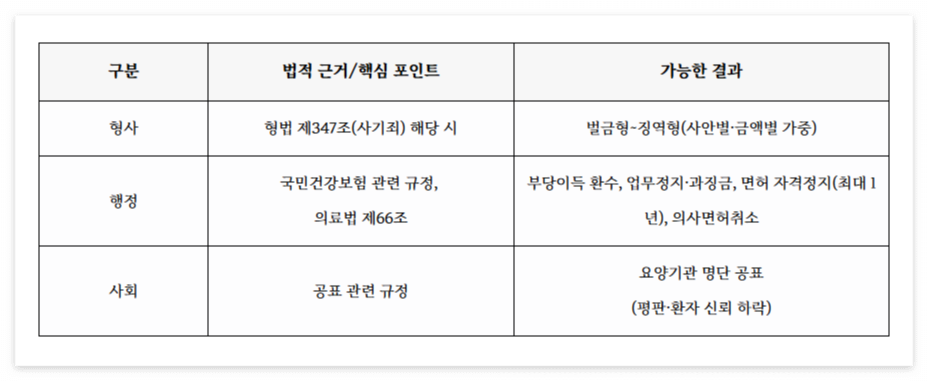 행정: 부당이득 환수, 업무정지 또는 과징금, 면허 자격정지(최대 1년, 의료법 제66조)