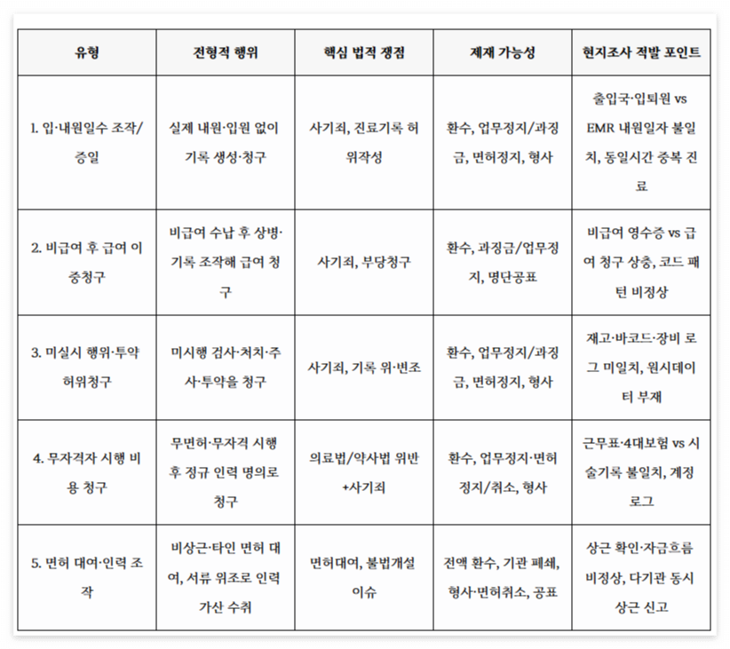 반복 패턴: 현장에서 반복되는 5가지 패턴은 (1) 입·내원일수 조작, (2) 비급여 후 급여 이중청구, (3) 미실시 행위·투약 허위청구, (4) 무자격자 시행 비용 청구, (5) 면허 대여·인력 조작이다.
